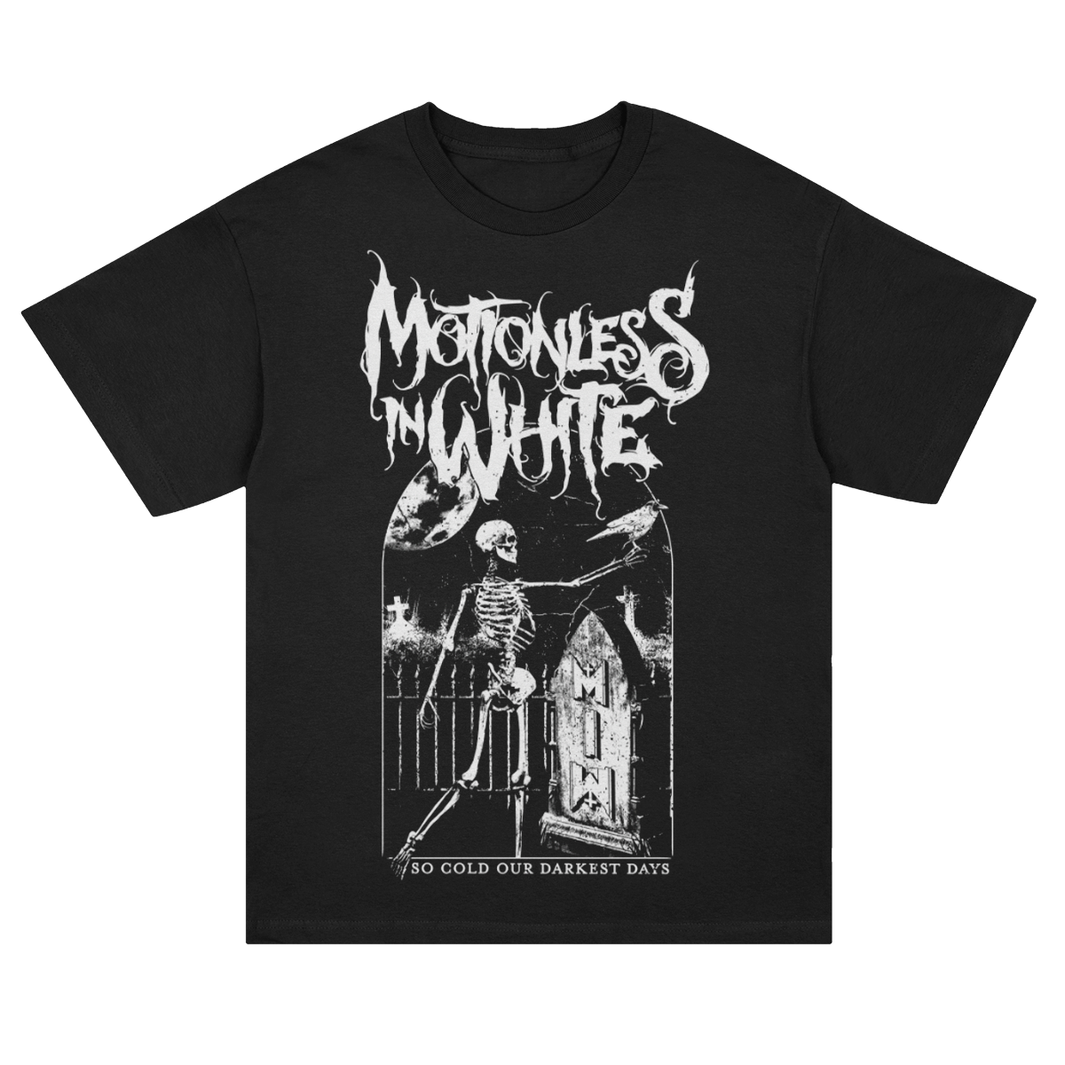 The Motionless In White Fatal design, printed on a black t-shirt.