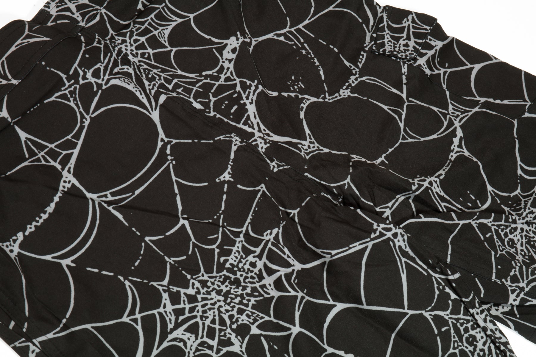 The Motionless In White Spiderweb design, featured on a pair of black custom board shorts.