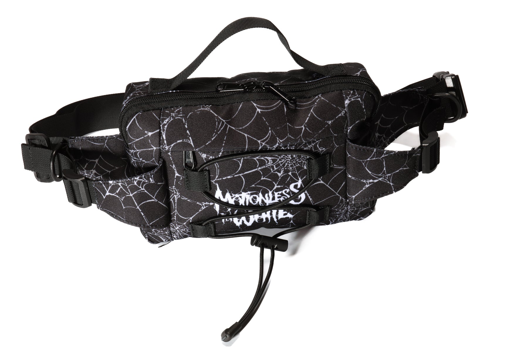 The Motionless In White Spiderweb design, featured on a black Cordura fabric fanny pack.