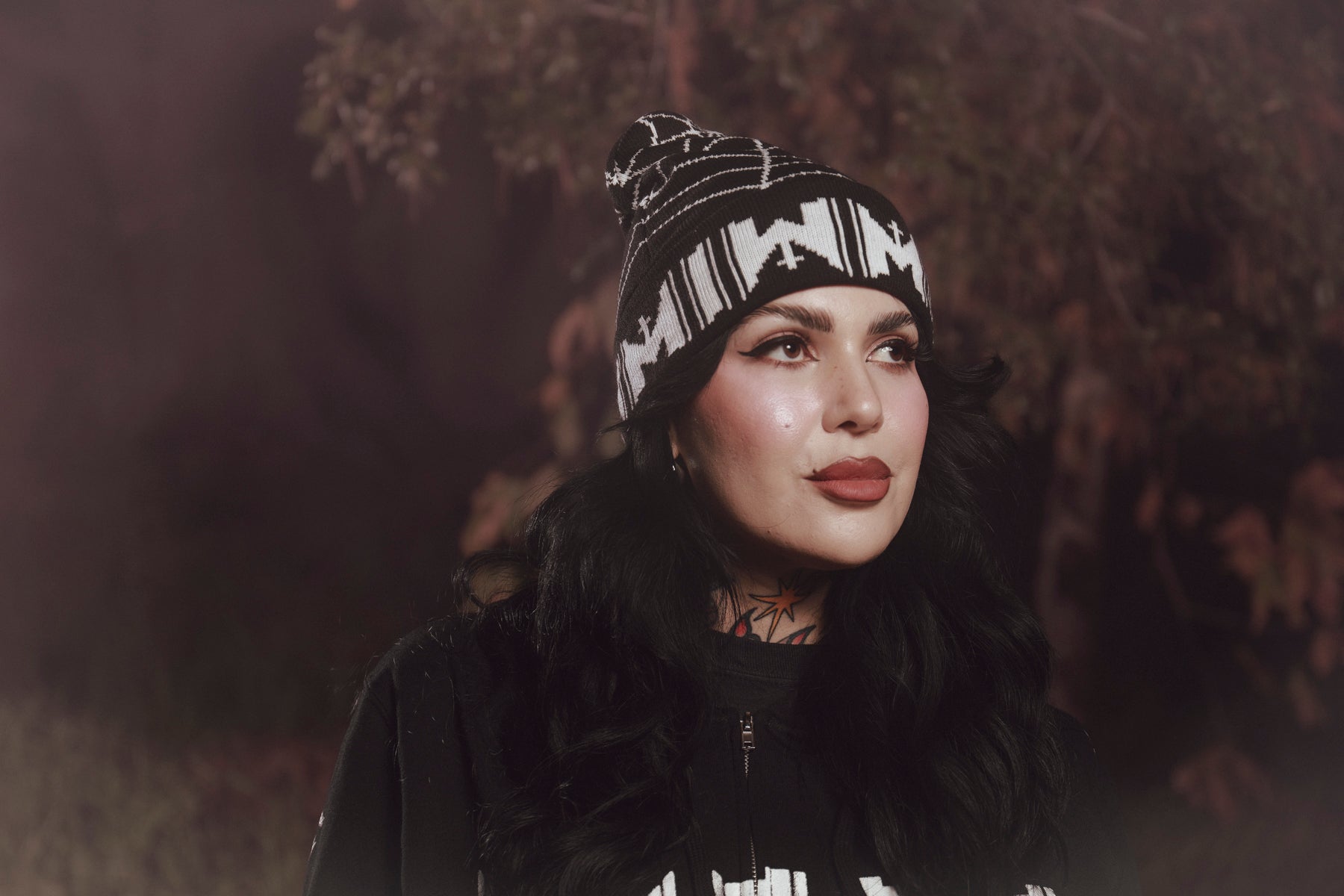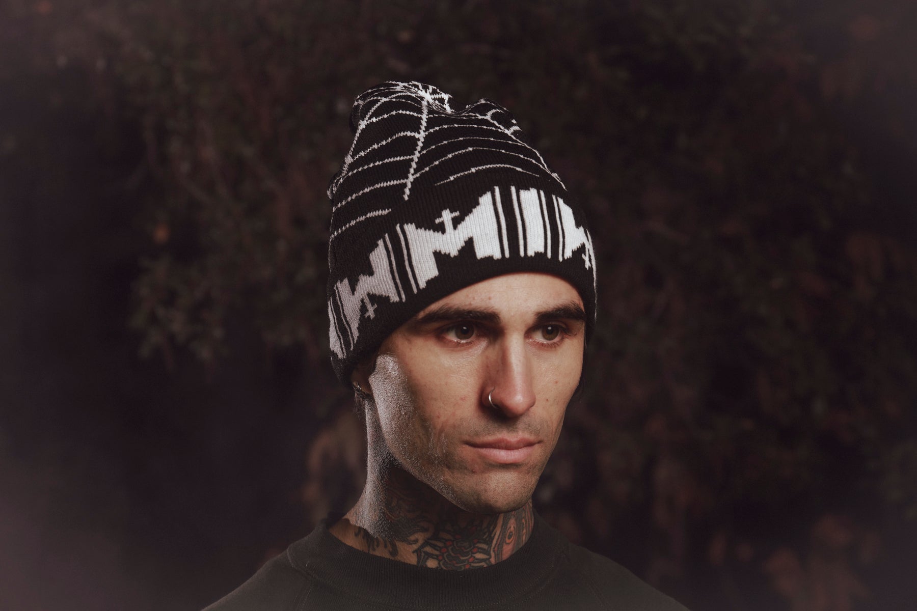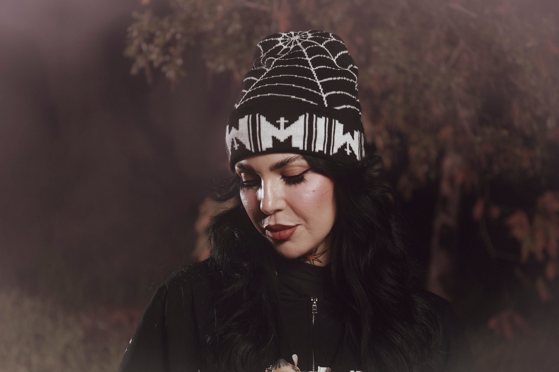 The Motionless In White Spiderweb design, printed on a black knit beanie.
